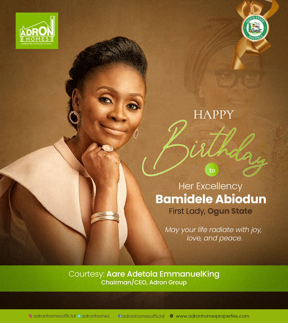 He wished her a joyous birthday filled with peace, prosperity, and continued success.Adron Homes and Properties Ltd., under the leadership of Aare Adetola EmmanuelKing, remains committed to supporting the growth and development of Ogun State and looks forward to continuing its collaboration with the government in achieving these goals.
